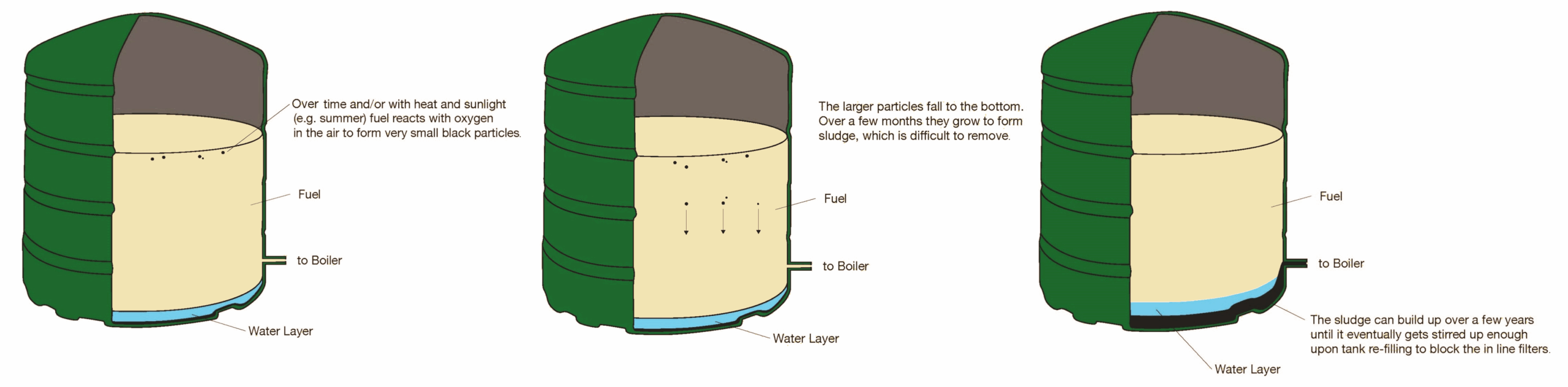 Better efficiency is obtained by reducing deposit and sludge build-up in your system. With standard fuel, in your storage tank the following happens…